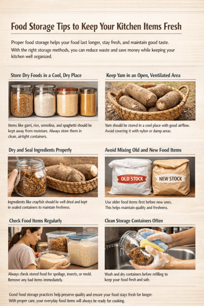 Items like garri, rice, semolina, and spaghetti should be kept away from moisture. Always store them in clean, airtight containers to prevent spoilage and insects.
